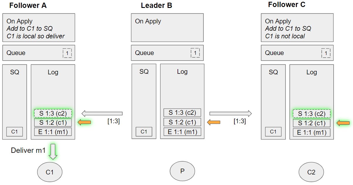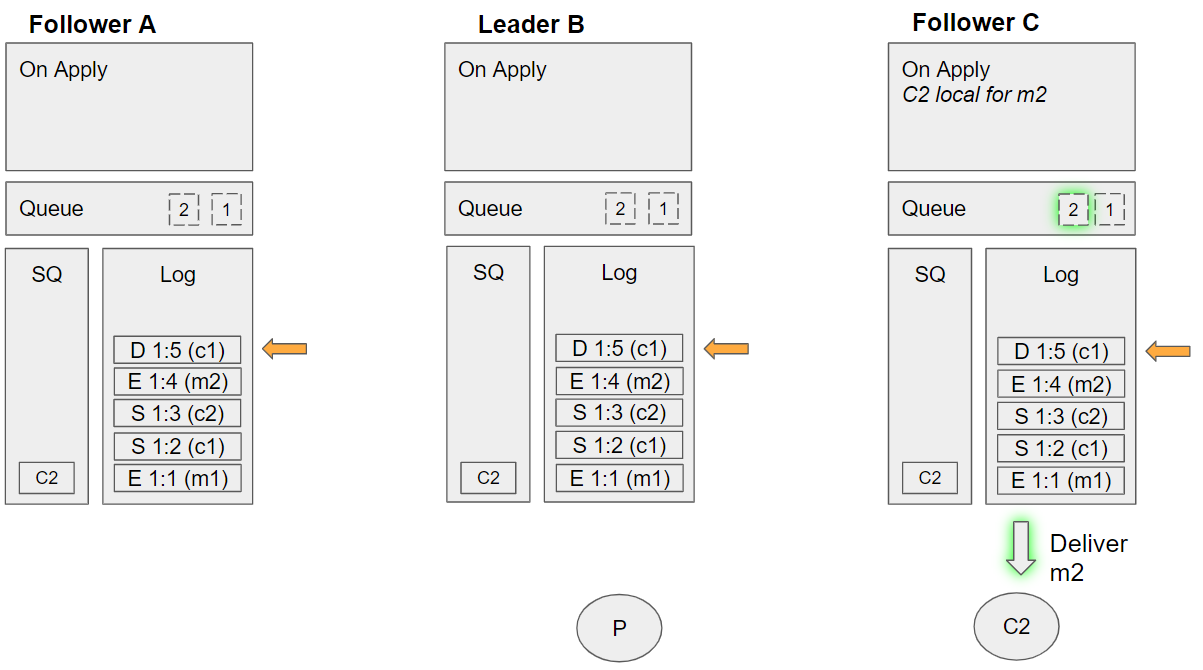 2. Follower C takes the next undelivered message, m1. Dequeues C2 from its SQ, and sees that C2 is local. Sends m1 to this local channel, requeues C2 on the SQ.