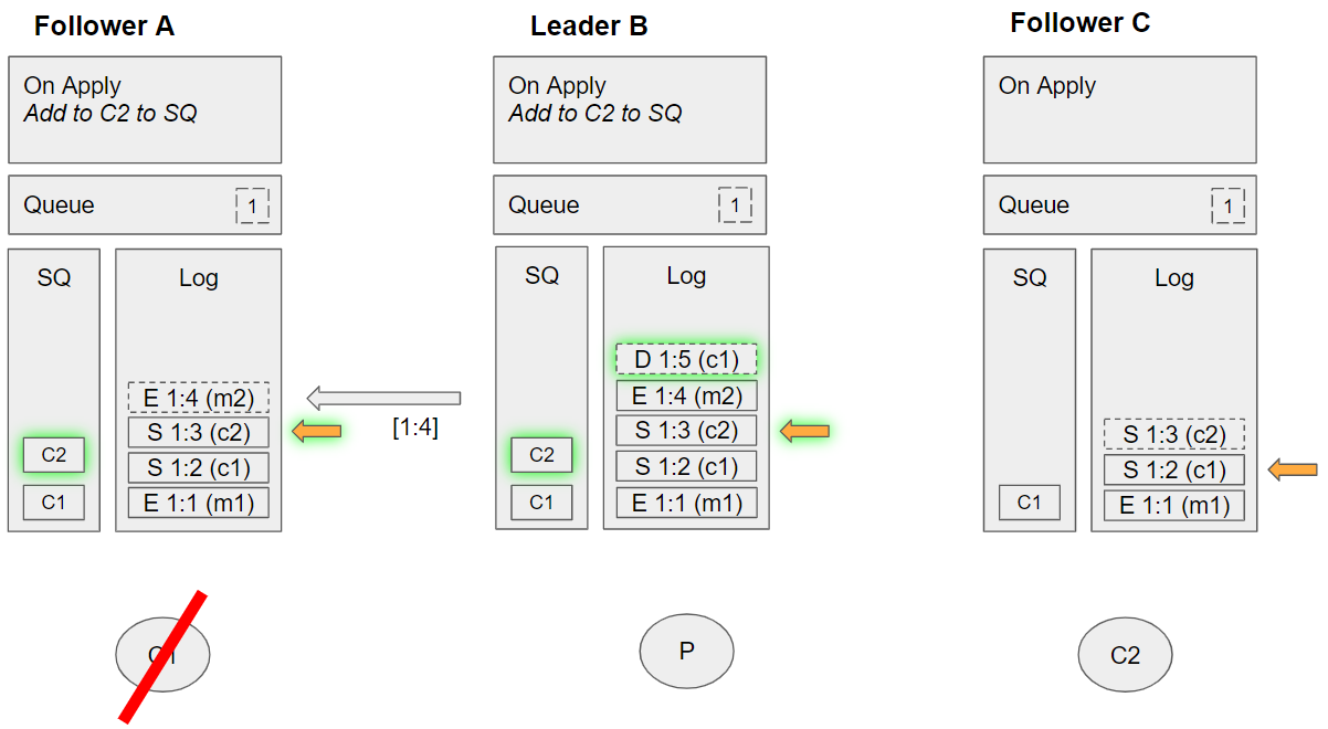 1. Removes the message from its queue *Follower C applies the enqueue m2 command: